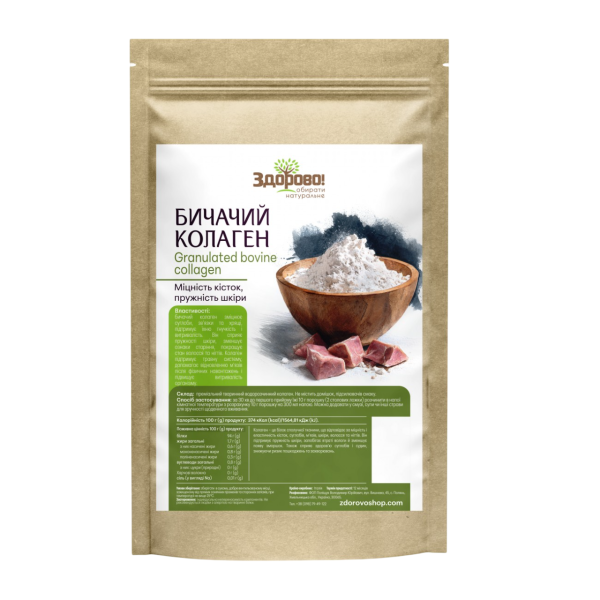 Натуральний яловичий колаген від ТМ «Здорово» — це чисте джерело гідролізованого білка (пептидів), що є основним структурним елементом нашого організму. Колаген відповідає за молодість шкіри, міцність волосся та еластичність сполучних тканин. Оскільки з віком природний синтез цього білка знижується, додаткове вживання високоякісного колагену в порошку допомагає підтримувати організм зсередини, забезпечуючи видимий результат зовні.