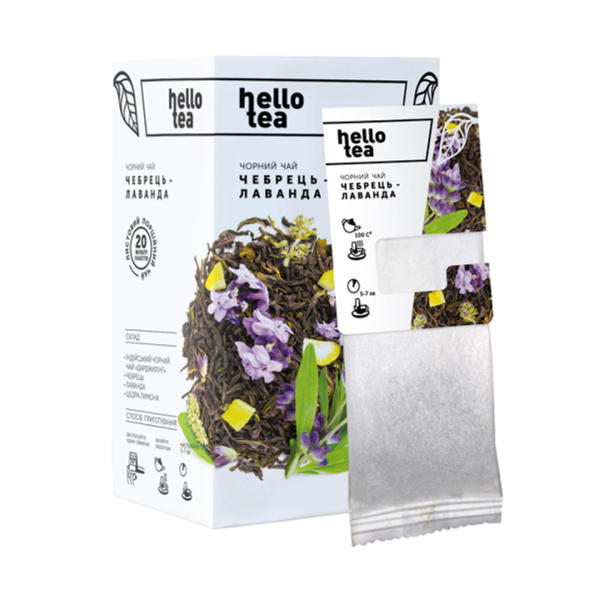 Чай чорний Hello Tea Чебрець лаванда – це запашний і смачний напій з тонким весняним ароматом та м’яким смаком. Ця чайна композиція розроблялася як напій-антистрес. Трави і квіти у складі чаю мають заспокійливий ефект і нормалізують роботу імунної системи. Квіти лаванди використовуються при хронічних стресових станах, тривозі та дратівливості. Вони покращують сон та заспокоюють. А чебрець є ефективним природним засобом для лікування кашлю, який рекомендується для профілактики простудних захворювань та грипу.