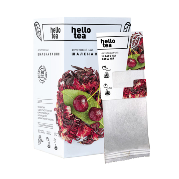 Склад чаю: пелюстки суданської рози, шматочки вишні, натуральний ароматизатор «Вишня».
