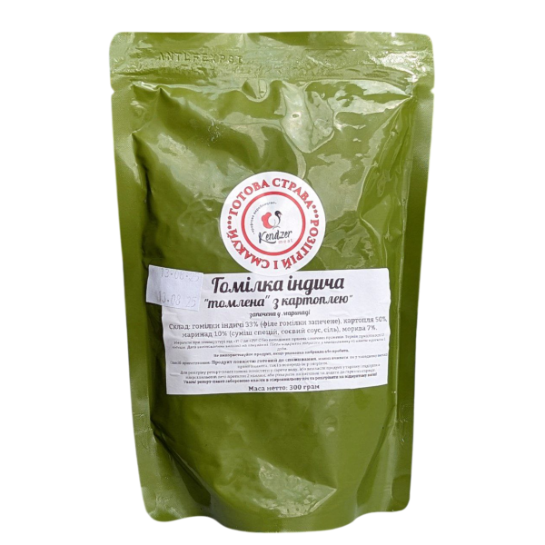 Склад: гомілки індичі 33% (філе гомілки запечене), картопля 50%, маринад 10% (сіміш спеція, соєвий соус, сіль), морква 7%.