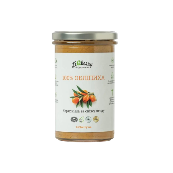 Паста з обліпихи LiQberry — це унікальний продукт, що поєднує в собі всі корисні властивості обліпихи завдяки інноваційній HTD технології. Виготовлена з натуральної органічної обліпихи без додавання консервантів, цукру чи води, вона містить подрібнене насіння, яке зберігає всі антиоксиданти, омега-3, омега-6 та омега-9 жирні кислоти.