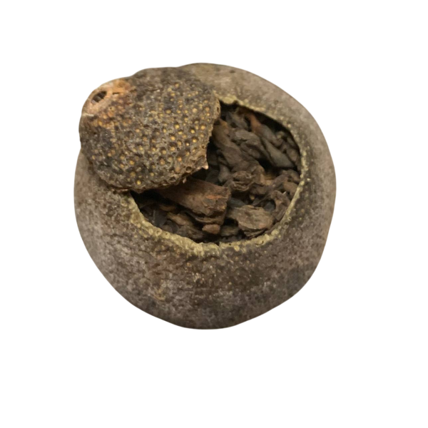 Китайський чай, шу пуер в мандарині, Зелений Мандарин, торгової марки Синь Ї Хао. Мандарин зібрано на плантація поблизу поселення Шизуй, провінція Гуандун, Китай. Чай з високогірних плантацій Юньнаня. Приготовлений на завод. Запакований в 2022 році.