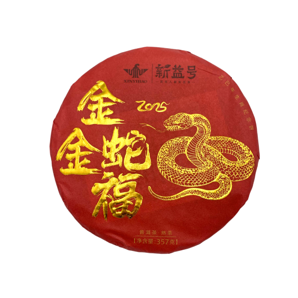 Китайський чай, шу пуер, Зодіак Золотої Змії, торгової марки Синь Ї Хао. Китай, Юньнань, Менхай, гора Цзінмай. Назва фабрики: Чайна фабрика округу Менхай Юньхе. Приготовлений з чайного листя зібраного в 2014 році, запакований в 2024 році.