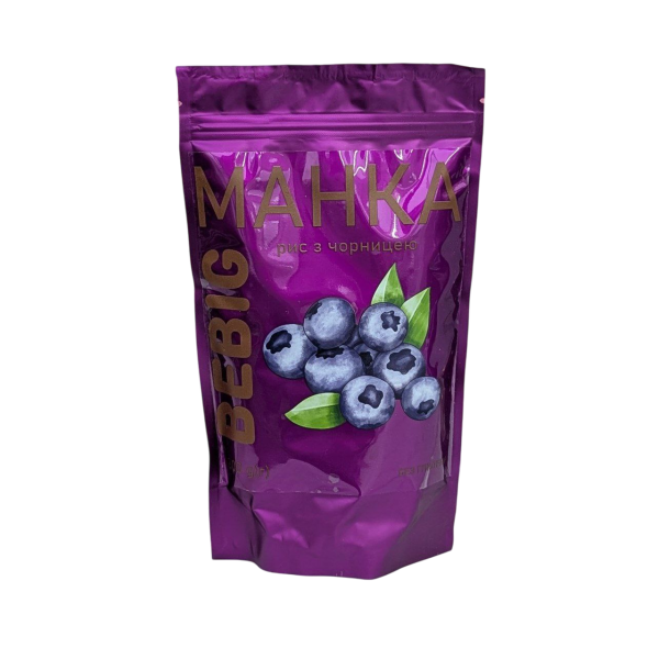 Склад: крупа рисова, чорниця сушена мелена, молоко кокосове сухе.