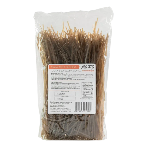 Паста із сорго від Ms Tally — це смачний і корисний продукт для тих, хто дотримується безглютенової дієти або шукає нові способи урізноманітнити своє харчування. Сорго, як основний інгредієнт пасти, є багатим джерелом рослинного білка, клітковини та важливих мікроелементів. Ця паста має відмінну текстуру, не розварюється при варінні та зберігає свій приємний смак. Вона підходить для приготування різноманітних страв і стане корисним доповненням до щоденного раціону.