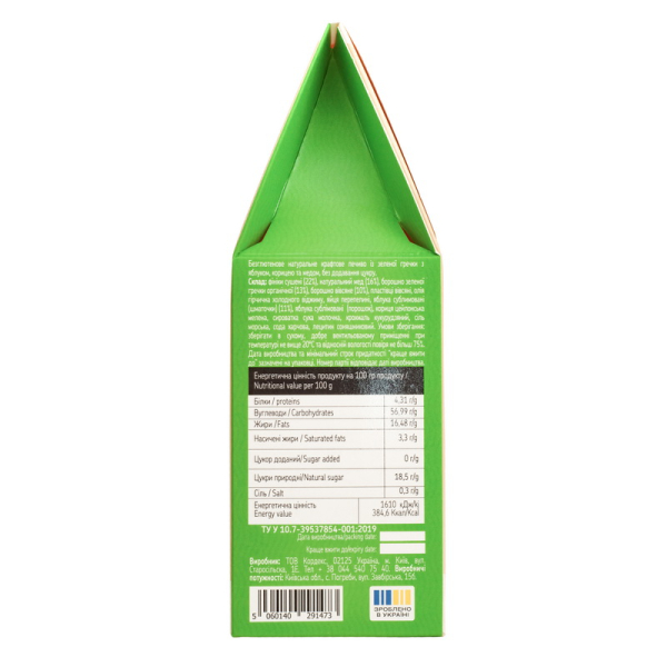 Склад: фініки (22%), мед (16%), борошно зеленої гречки органічної (13%), борошно вівсяне (10%), пластівці вівсяні, олія гірчична холодного віджиму, яйця перепелині, яблука шматочки (11%), яблука порошок, кориця цейлонська мелена, сироватка молочна суха, крохмаль кукурудзяний, сіль морська, сода харчова, лецитин соняшниковий.
