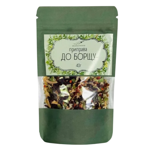 Приправа до борщу допоможе створити дійсно унікальний смак цієї справжньої, суто української страви. До її приправи входять: буряк, морква, цибуля різана, цибуля порей, паприка червона різана, петрушка зелень, часник сушений, томат різаний. За допомогою суміші спецій можна додати страві легкого аромату зелені та особливого смаку.