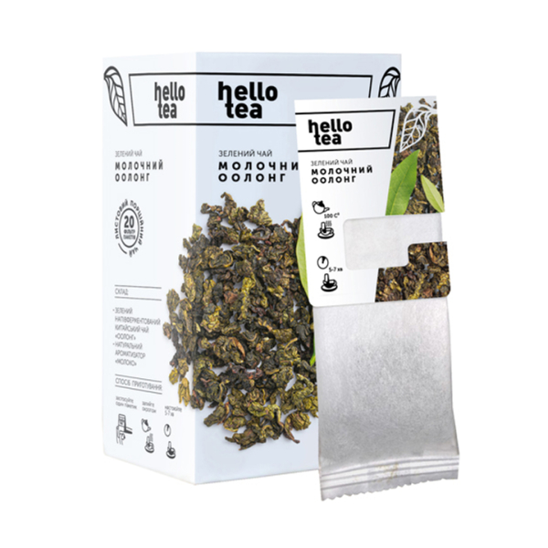 Чай зелений Hello Tea Молочний Оолонг – це зелений напівферментований китайський чай з насиченим смаком та чарівним вершковим ароматом. Молочний смак чай набуває завдяки тому, що зібране листя чаю обробляють молочним екстрактом. Хоча є помилкова думка, що при виробництві використовується молоко. Молочний оолонг – вкрай корисний напій. Він багатий антиоксидантами, вітамінами та мінералами, містить кофеїн, поліфенол, аскорбінову кислоту та ефірні олії. Цей чай зміцнює організм, сприяє обміну речовин та швидкій регенерації клітин, допомагає шкірі довше залишатися молодою.